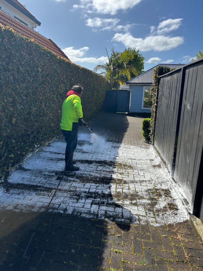Deep cleaning of surfaces using pressure washing combined with appropriate cleaning chemicals to remove dirt, grime, mould, and stains, leaving the area clean and refreshed.