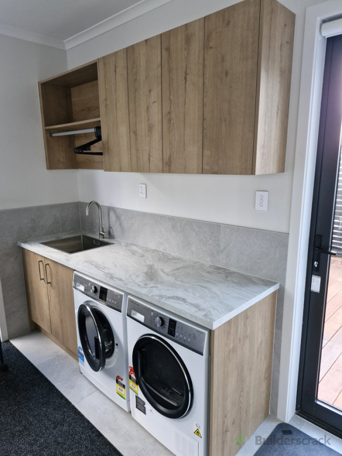 Simple melamine laundry cabinets with laminate benchtop.
