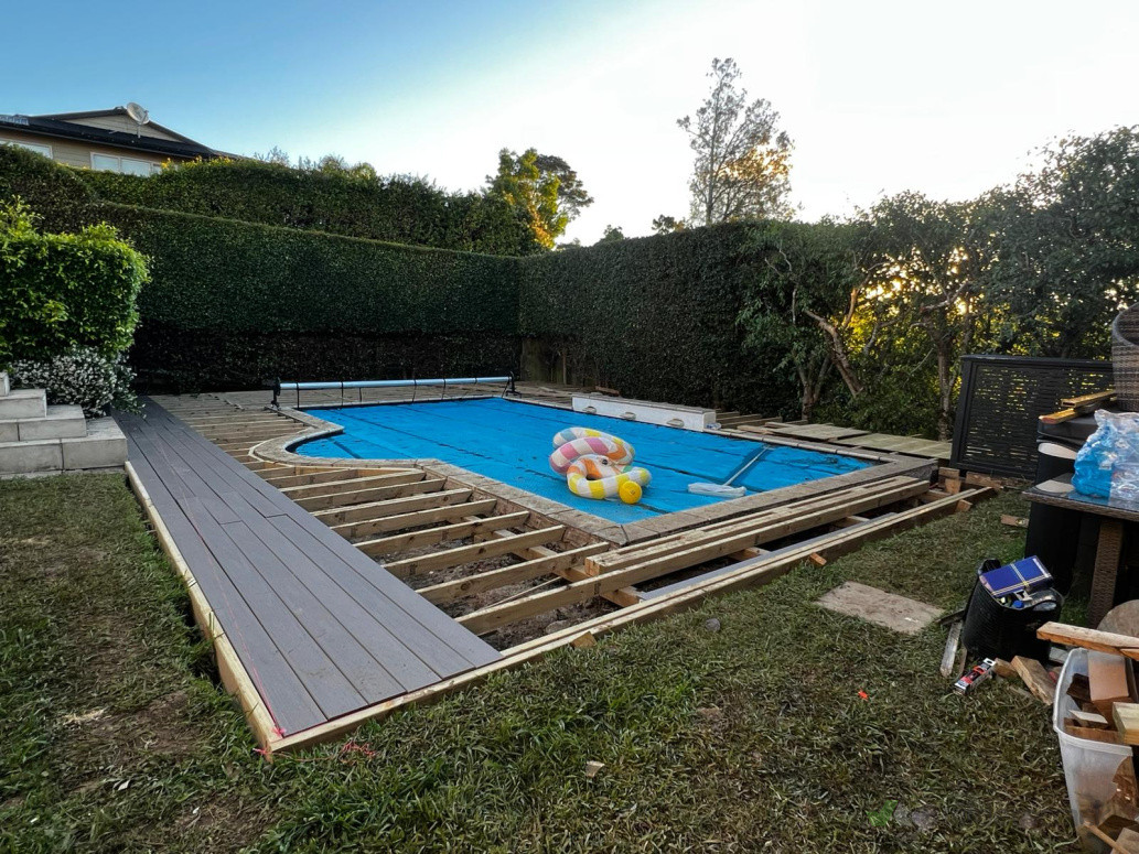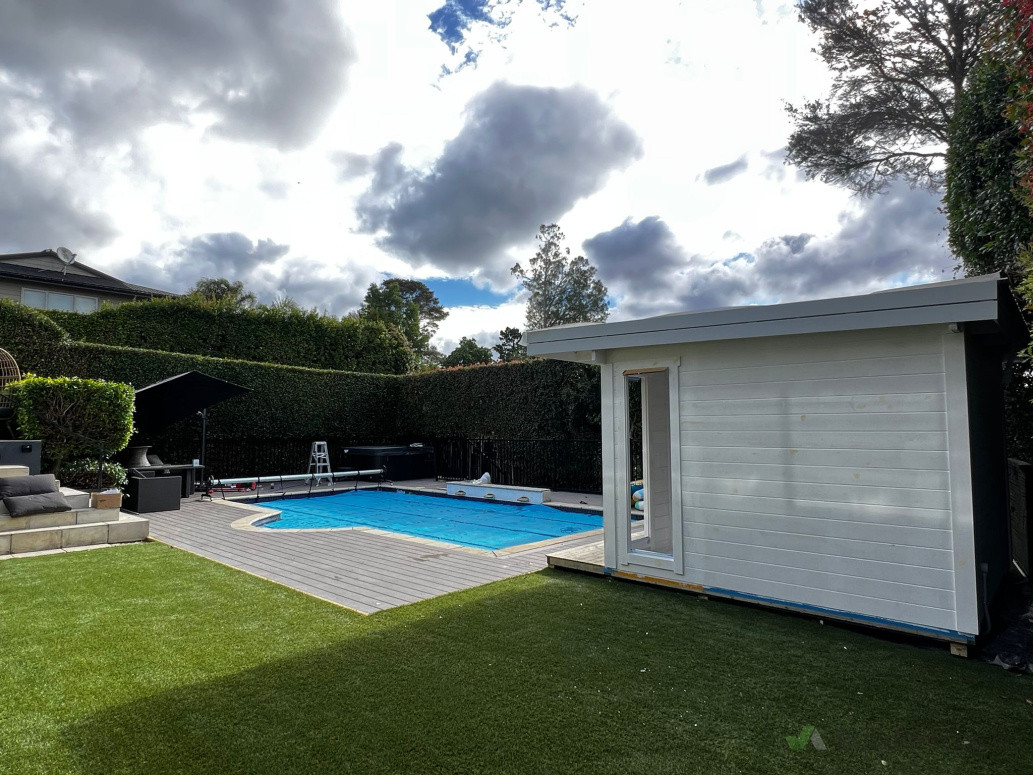 Our client chose top of the line TREX decking timber for a hard wearing surface around the pool. We also crafted a garden house for use as a home office