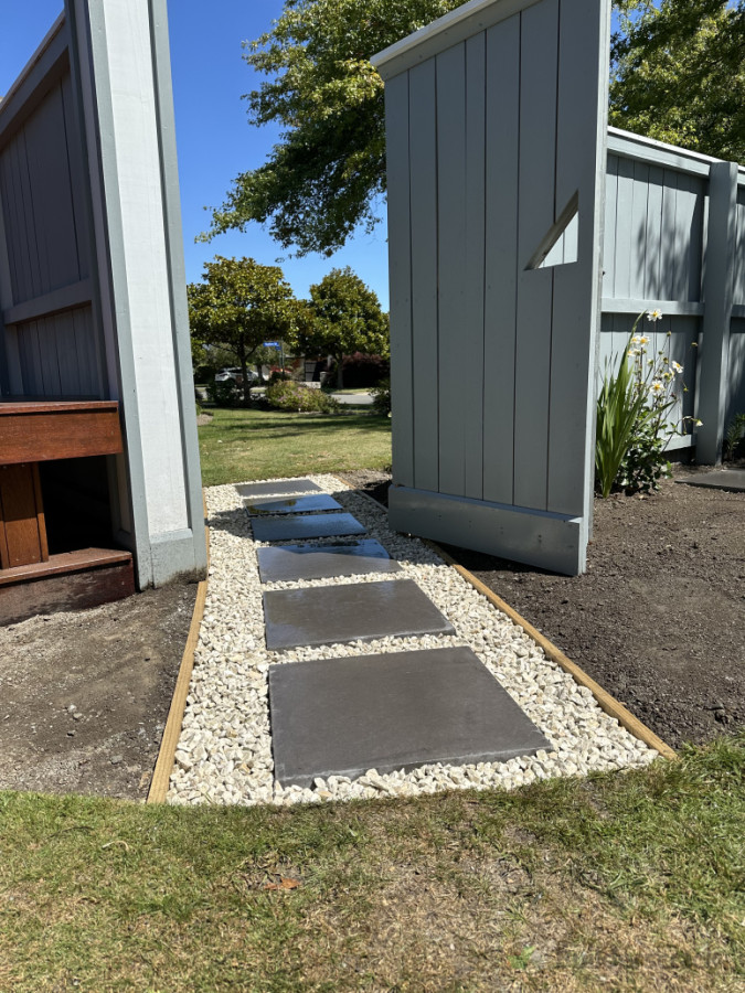 Curved path using 500x500mm sandy charcoal pavers and 20mm white ivory chip. Patio using same pavers.
