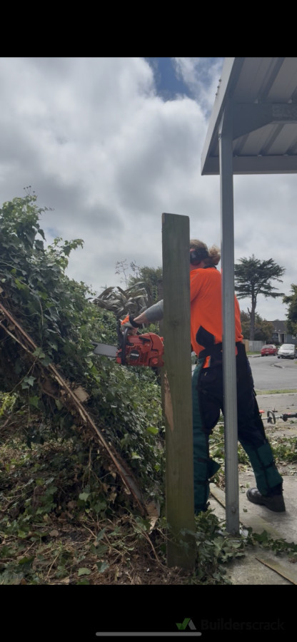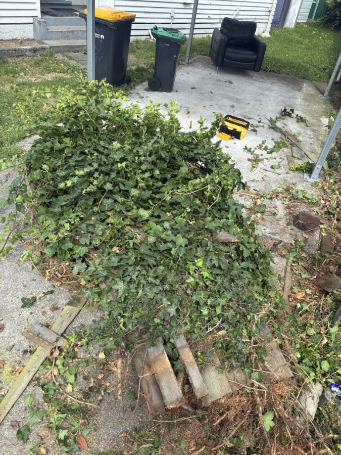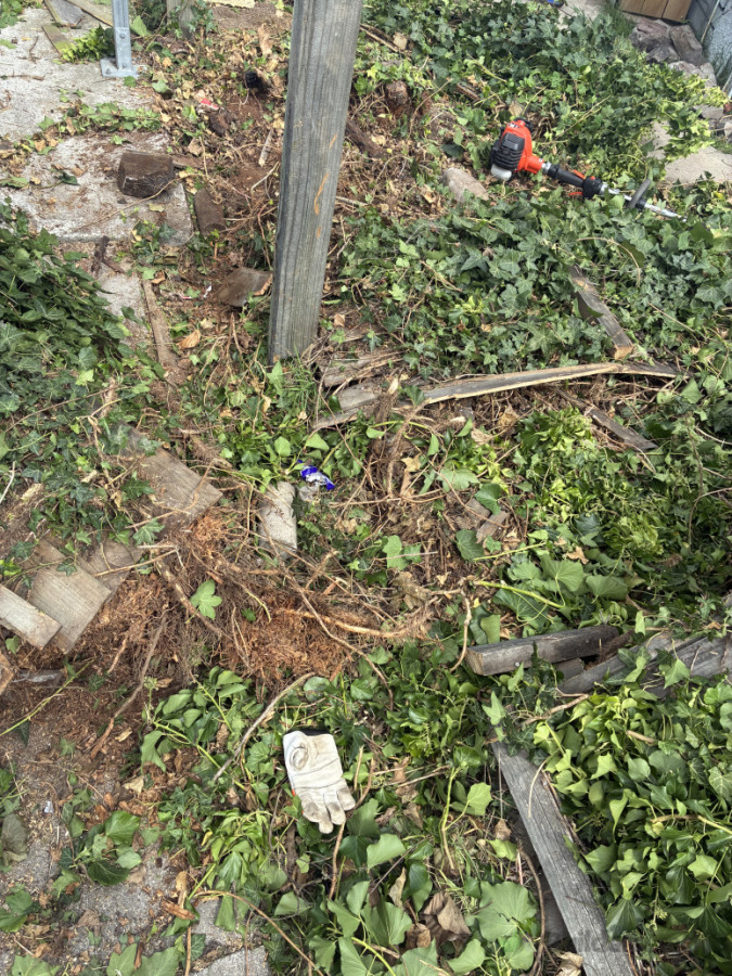Removal of decades worth of ivy growth that had started pulling a fence down.