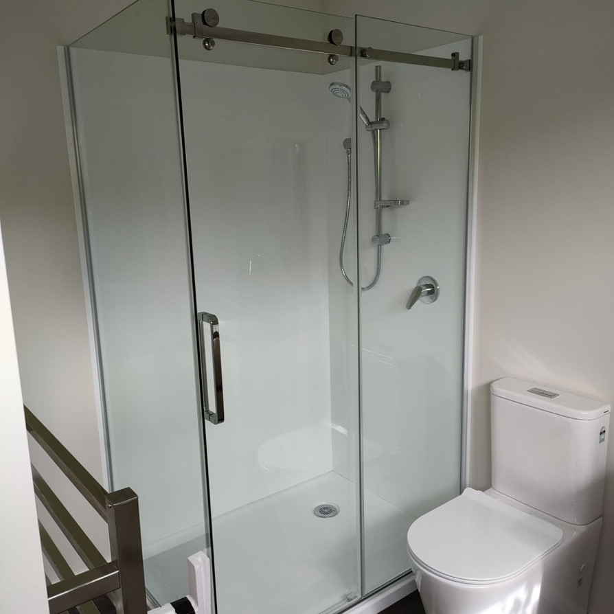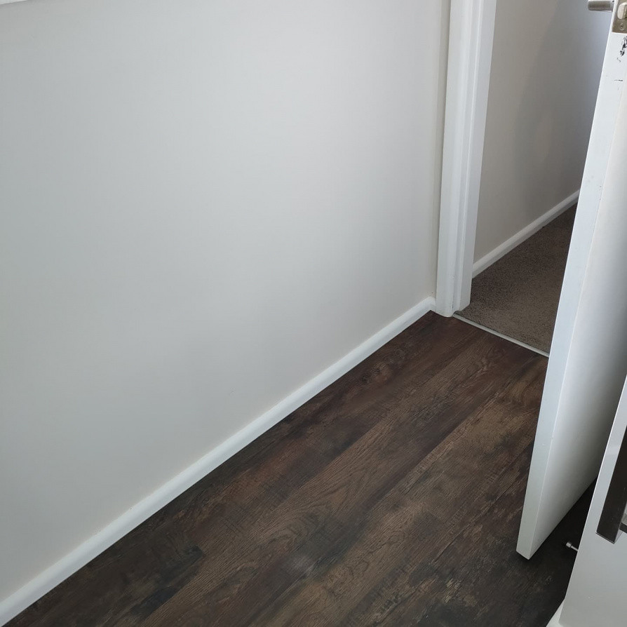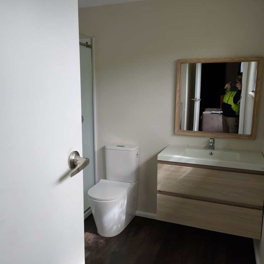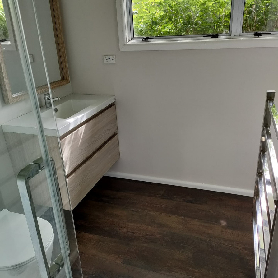 Removal of old bathroom fixtures and wall linings, install shower, toilet, vanity, mirror, heated towel rail, plaster and paint work, new vinyl plank flooring, plumbing work.