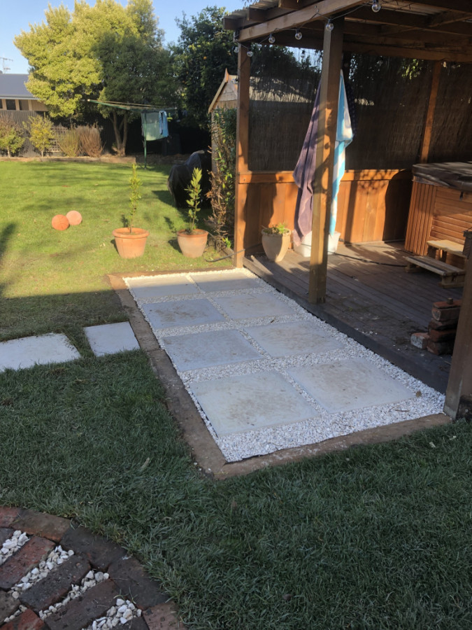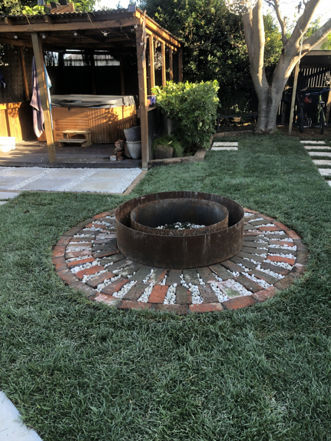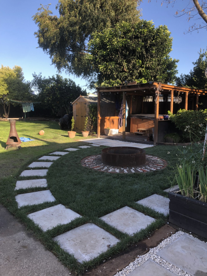 Steeping stones, paved area boarders with railway sleepers. Old brick fire floor