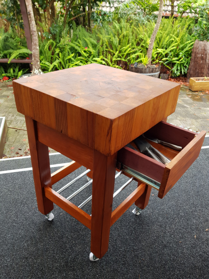 We took a tired old butchers block and gave it a new lease of life by sanding, staining, adding a drawer, castor wheels and metal rod shelf.