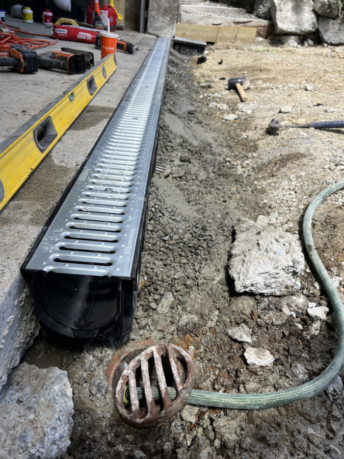 Break out concrete, set sumps and slot drains,saw cut. Broom finish