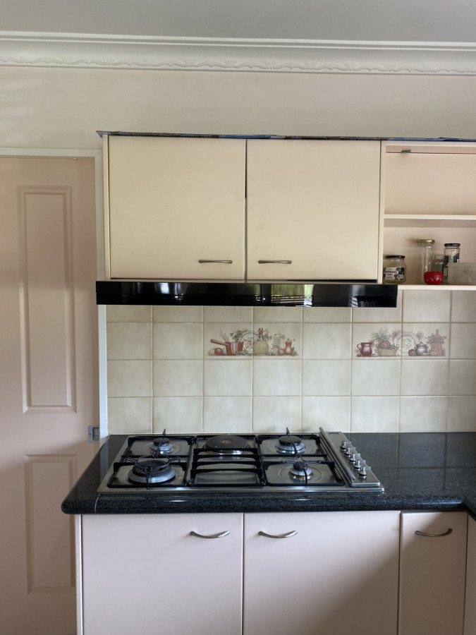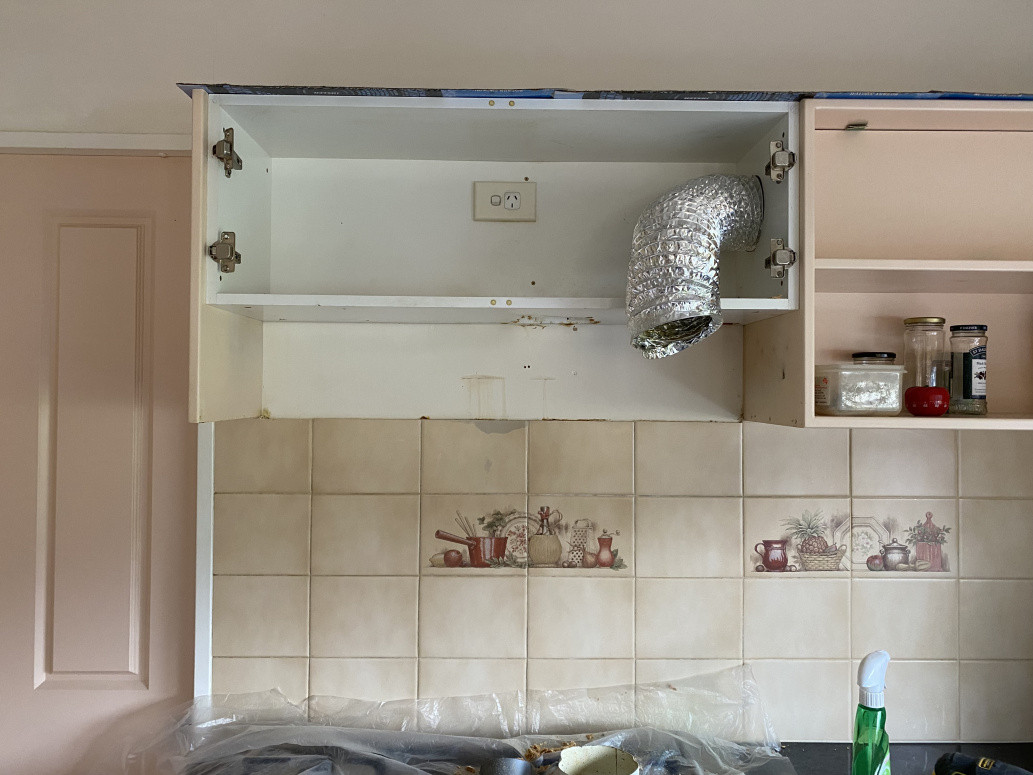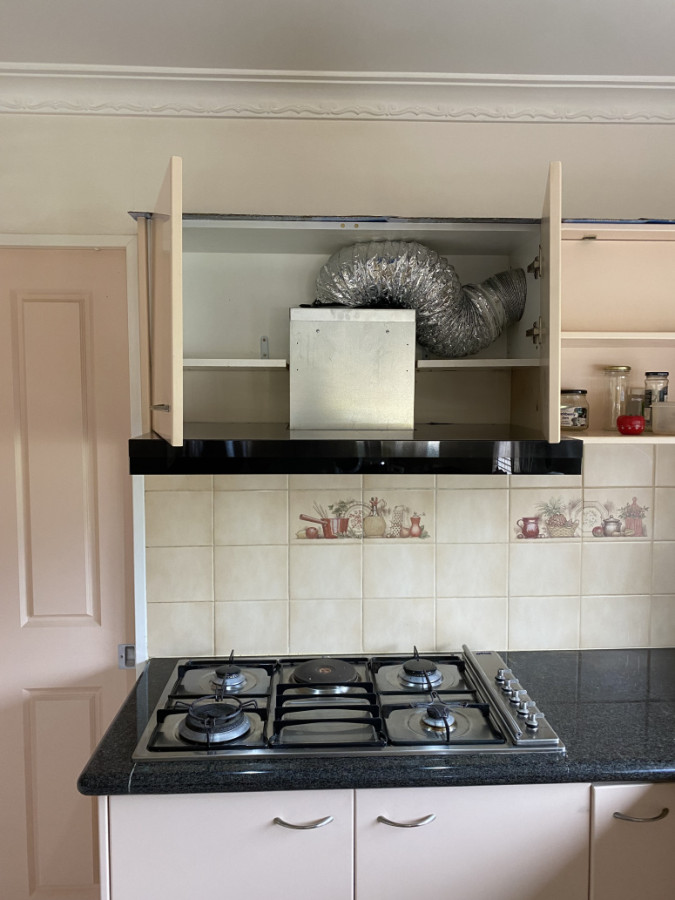 Old rangehood is failing (intermittent fault) and customer opted to replace with a stronger unit without removing cabinet.