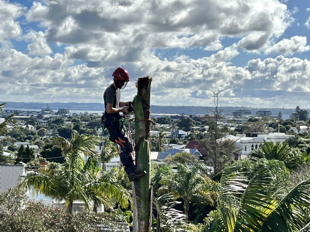 Small Bangalow palm removal with a nice backdrop of Auckland City.