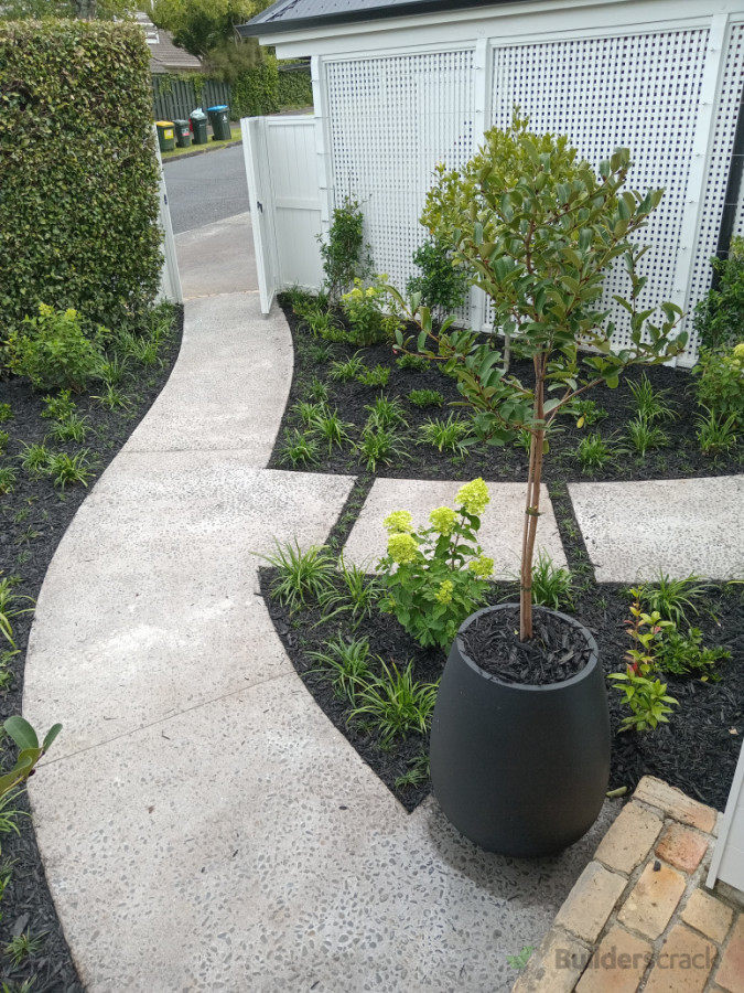 Modern front garden with planting + exposed concrete path + pots + espalier