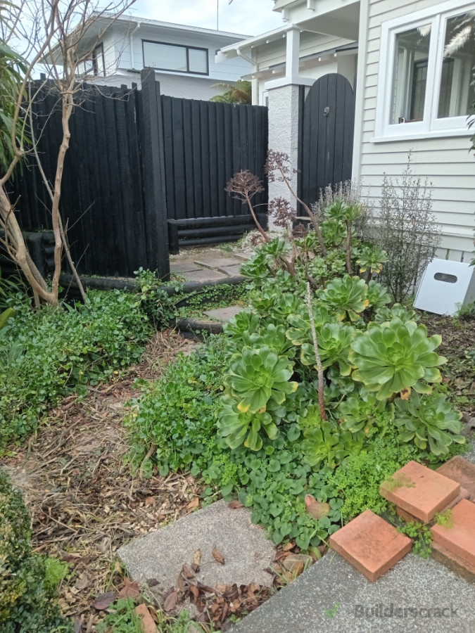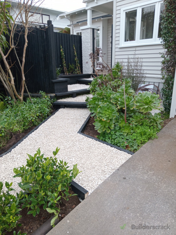 Pebble path with edging + gardens beds with espalier to grow some Jasminum