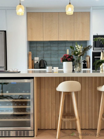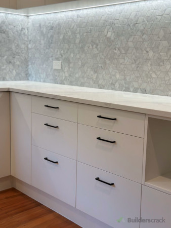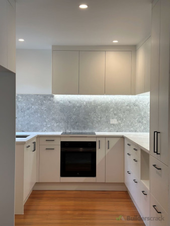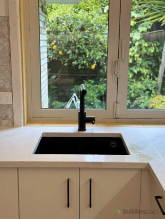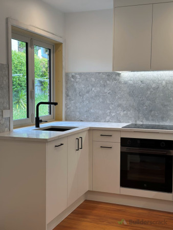 This Mission Bay kitchen renovation combines modern design with functionality. The L-shaped layout maximizes space, featuring sleek off-white cabinetry, an engineered stone benchtop, and a geometric marble tile backsplash for a touch of elegance. Matte black fixtures contrast beautifully, while LED strip lighting enhances both task lighting and ambiance. The design reflects New Zealand’s preference for bright, open, and stylish yet practical kitchens. 1. Demolition & Preparation - Removal of old cabinetry, benchtops, and splashback - Wall surface preparation for new installation 2. Cabinetry & Storage - Installation of custom-built, soft-close cabinetry in an off-white finish - Matte black handles for a modern contrast 3. Benchtop & Splashback - Engineered stone benchtop for durability and easy maintenance - Geometric marble tile backsplash for a stylish accent 4. Fixtures & Appliances - Matte black kitchen tap and undermount sink installation - Integrated induction cooktop and modern oven setup 5. Lighting & Electrical - LED strip lighting under upper cabinets for better visibility and ambiance - Power outlets installed for convenience 6. Flooring & Finishing Touches - Retained and polished timber flooring for warmth and contrast - Window frame refinishing to match the modern aesthetic This renovation focuses on a balance of style and practicality, aligning with New Zealand’s preference for bright, functional, and inviting kitchen spaces.