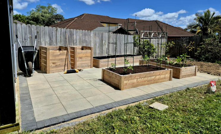 Sleepers added to create amazing garden beds, pebbles and steppingstones to create a low maintenance pathway.